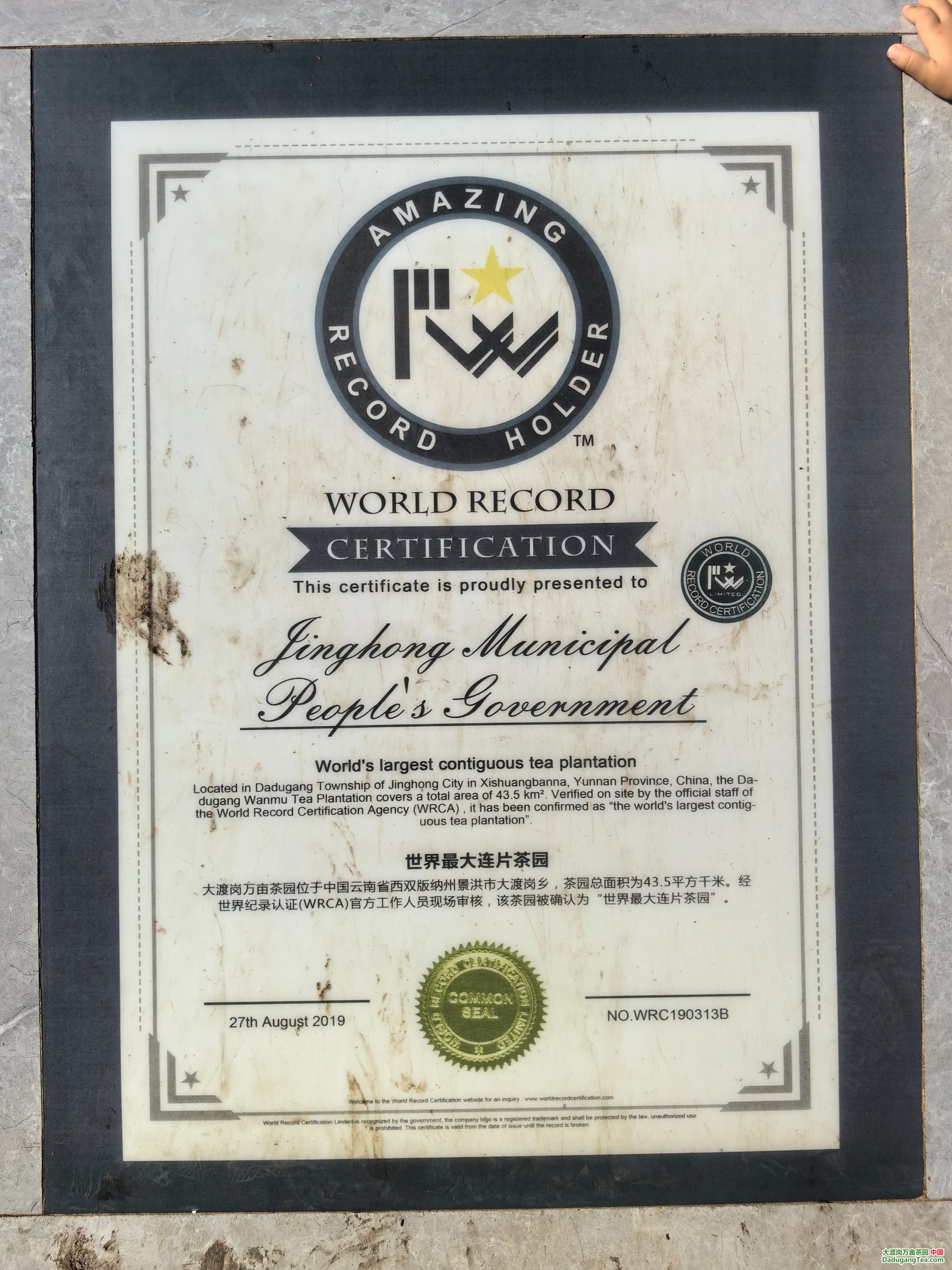 The world's largest contiguous tea garden The Dadugang 10000 acre tea plantation is located in Dadugang Township, Jinghong City, Xishuangbanna Prefecture, Yunnan Province, China, with a total area of 43.5 square kilometers. After on-site inspection by official staff of World Record Certification (WRCA), the tea plantation has been confirmed as the "world's largest contiguous tea plantation".